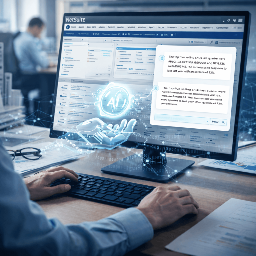 AI changes this by giving every user in your organization a natural language interface to your data. Instead of learning where to find a report, a manager can simply ask: "What were our top five selling SKUs last quarter, and how does that compare to the same period last year?" The answer comes back in seconds, pulled directly from NetSuite.